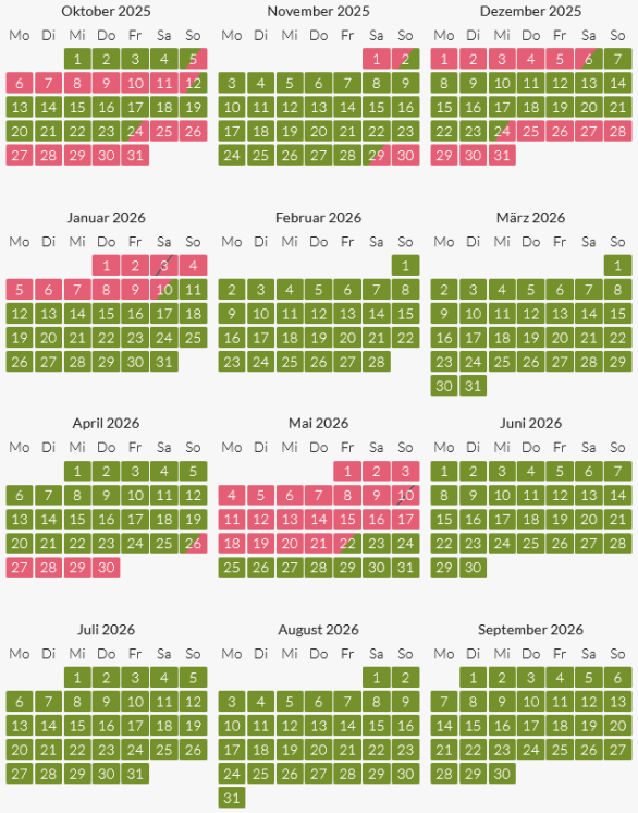Andere Zeiträume und Resttage auf Anfrage.
