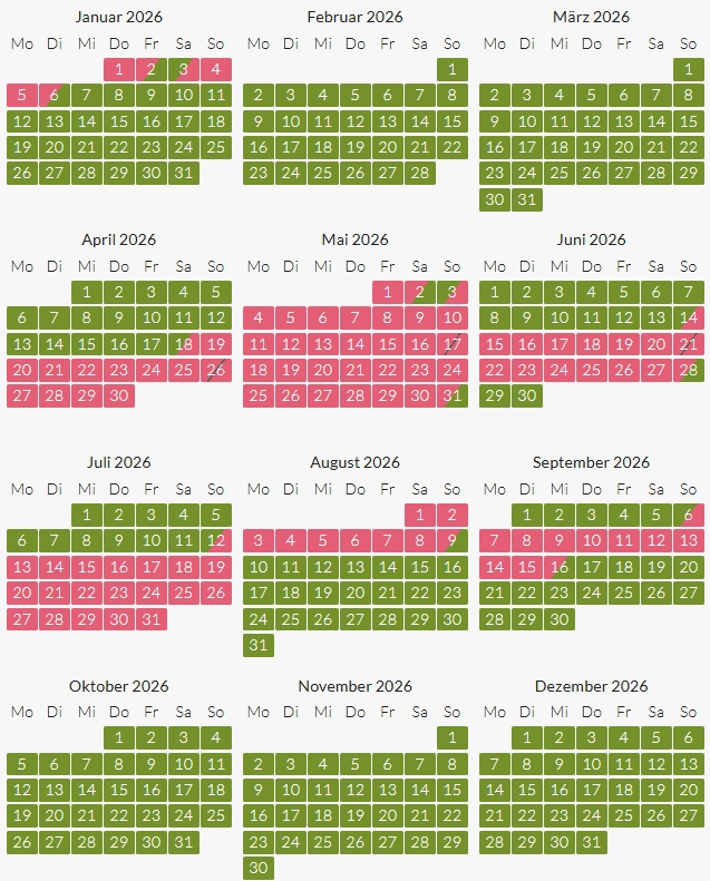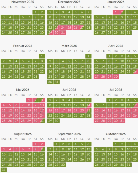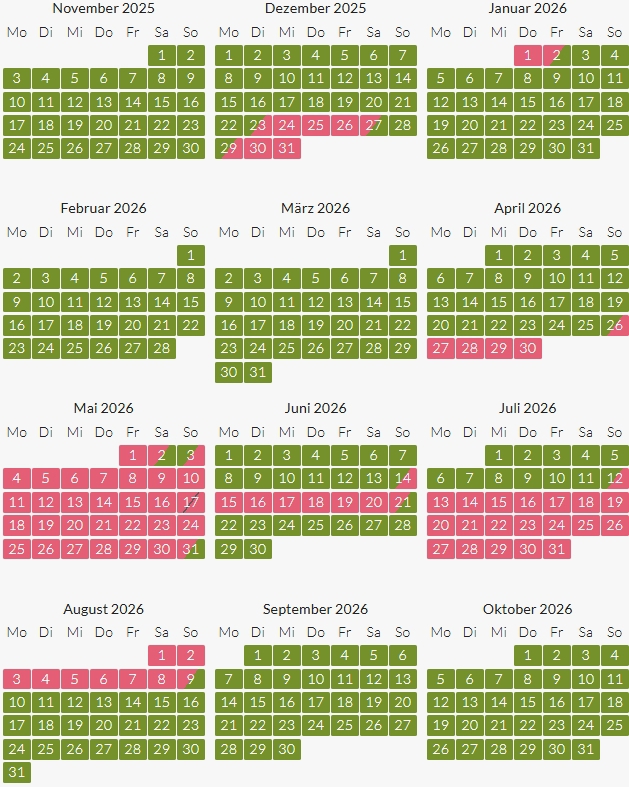 Andere Zeiträume und Resttage auf Anfrage.